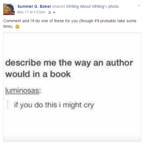 The Friday before I was to take a one-week vacation, I was using my phone at work when I wasn’t supposed to, scrolling through Facebook. I came across the original post shown above, which asks the reader to describe them the way an author would in a book. As I went to repost, I knew no one would go along with the request, because effort. But people love to hear about themselves and I like to observe others, so. The offer to write character descriptions about the people who commented was born.